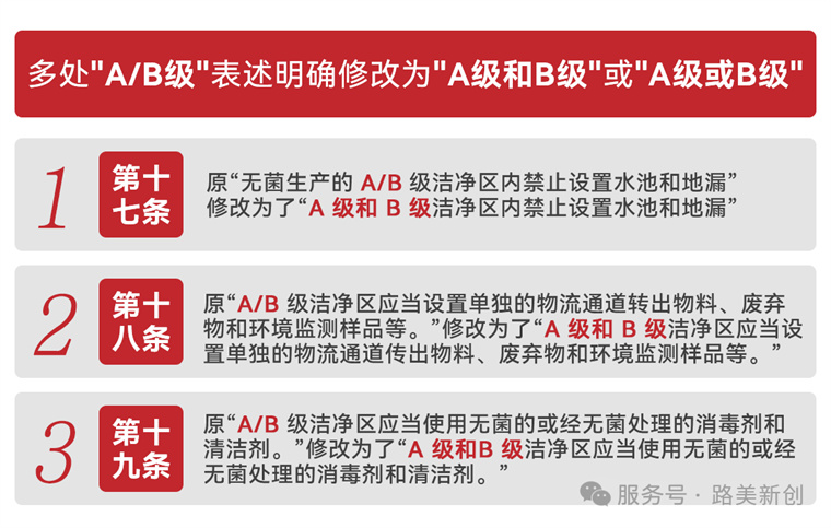洁净区级别表述规范化:全文将多处“A/B级”的表述统一修订为“A级和B级”或“A级或B级”,例如第十七条、第十八条、第三十二条等条款,使描述更加清晰准确。