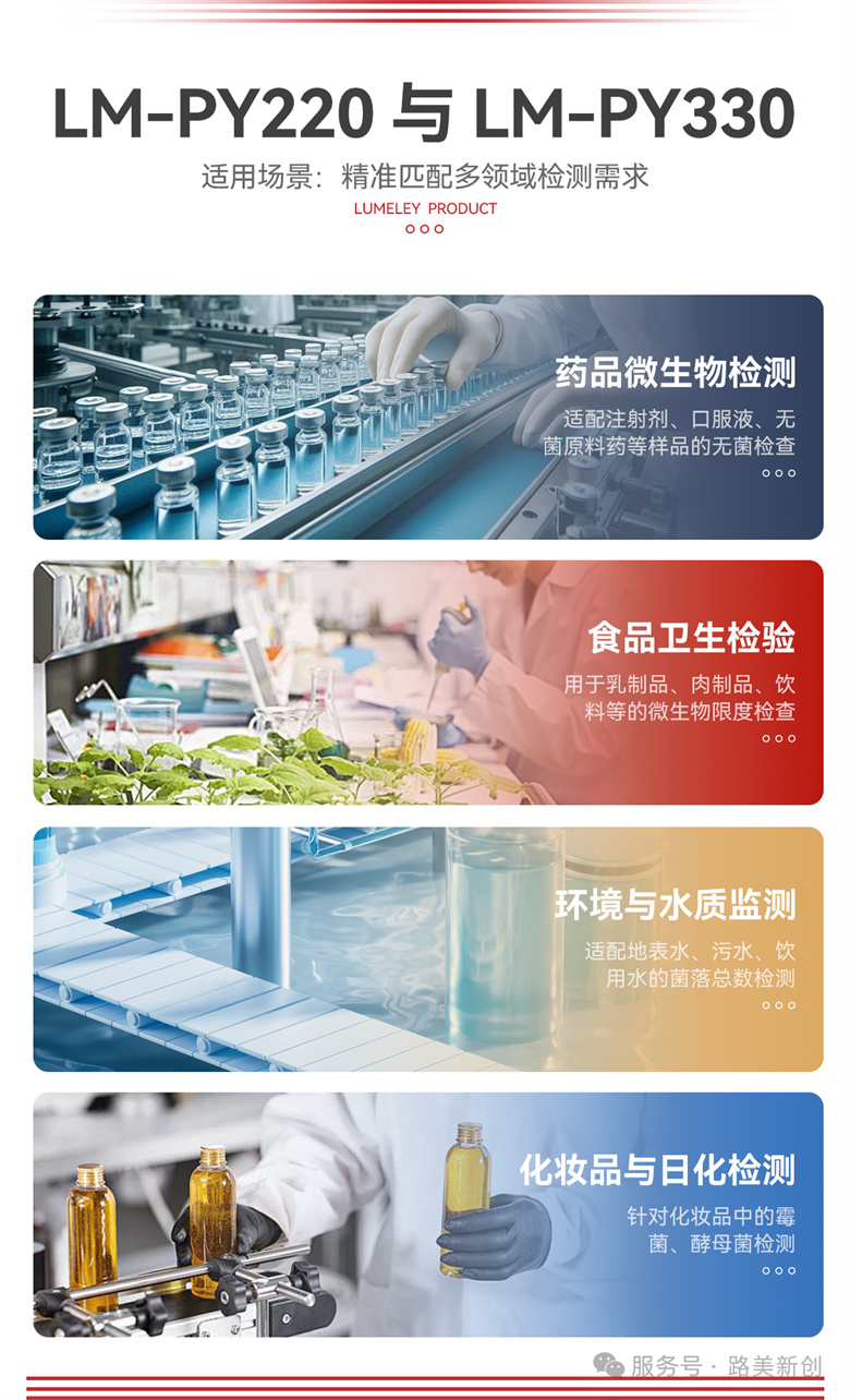 LM-PY220 与 LM-PY330 虽核心技术一致,但适配不同检验量需求,能覆盖药品、食品、环境三大核心检测领域: