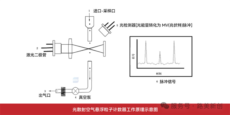 粒子计数器从采样口吸入含有悬浮粒子的气体,悬浮粒子进入测量腔后受到光源发出的单色光照射,单色光发生不同程度的散射,检测器将散射光脉冲信号转化为电脉冲信号。散射光的强度与悬浮粒子表面积成比例关系,散射光的脉冲数量与悬浮粒子的数量成比例关系,因此电脉冲的幅度对应粒子的粒径大小,电脉冲的数量对应悬浮粒子的数量,即粒子浓度。